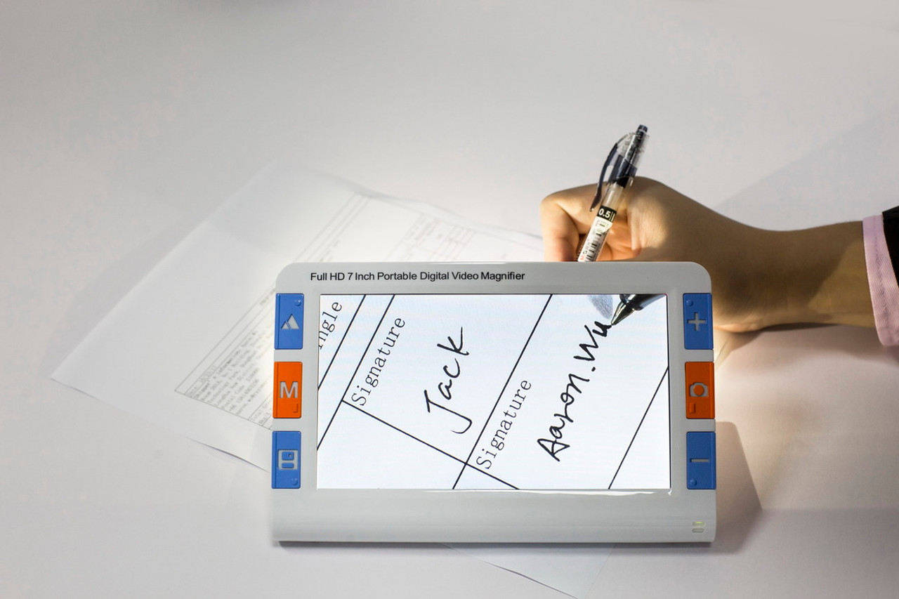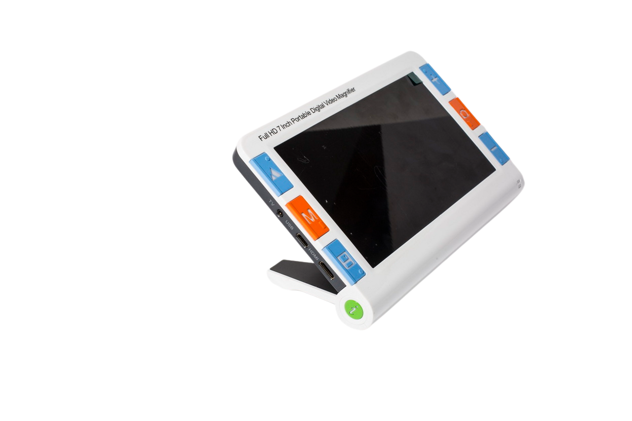Lupa electrónica portátil HD de 7″ con cámaras duales de 8 megapíxeles. Aumento de 2X-32X, visualización de cerca y de lejos. Línea de lectura, fotograma congelado de imagen y función de notas de voz. Salida de TV y USB-C para carga. Duración de batería de 4 horas.