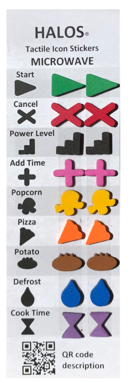 Este paquete multicolor incluye 9 pegatinas autoadhesivas con formas y colores específicos para identificar las funciones más populares de su microondas. Cada pegatina está elevada para facilitar la identificación táctil y forma parte del sistema HALOS, diseñado para mejorar la accesibilidad de los electrodomésticos.