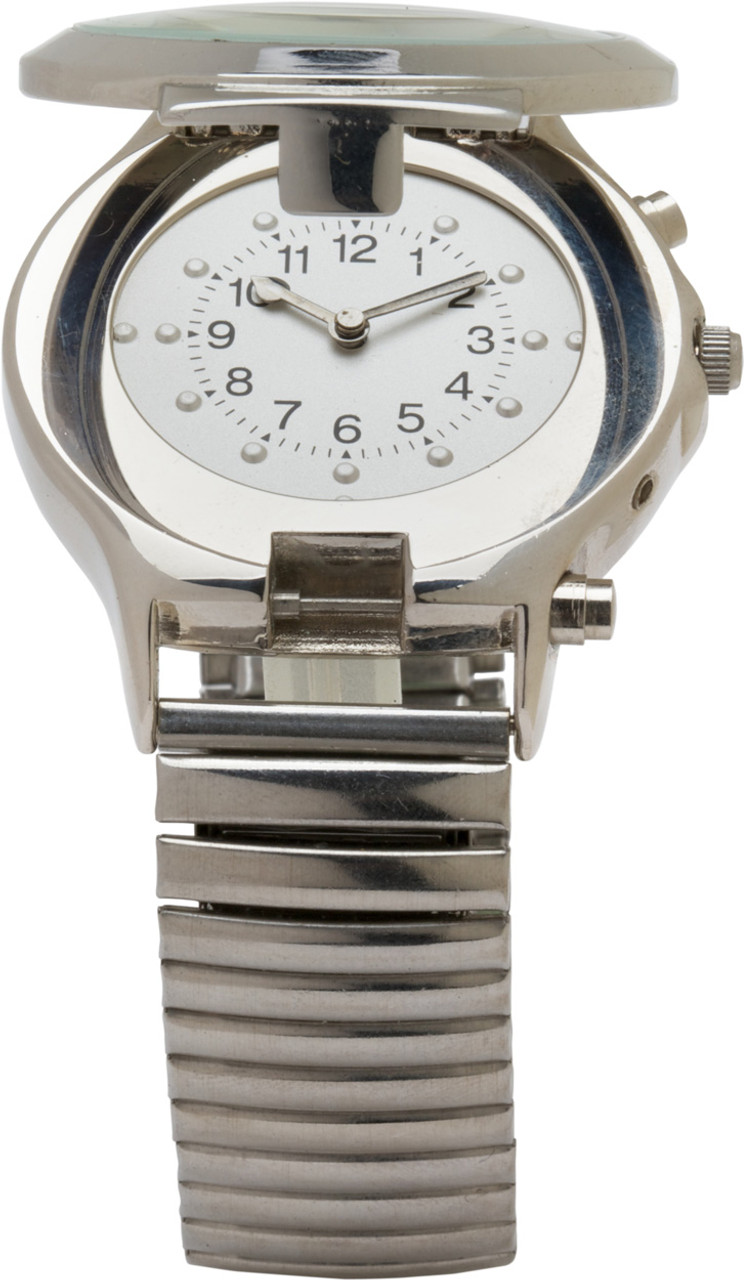 Este reloj Braille en tono plateado también tiene funciones de habla. El cristal tiene un mecanismo fácil de abir para tocar la parte del reloj que es braille y poder leer la hora.